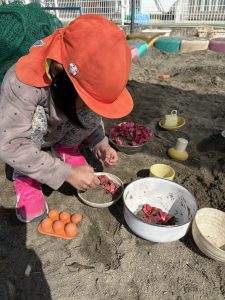 砂場では椿の花を集めてごちそうができている